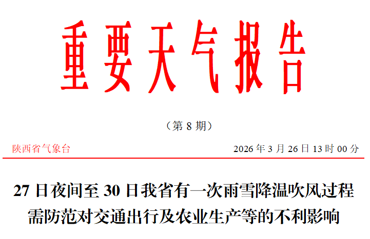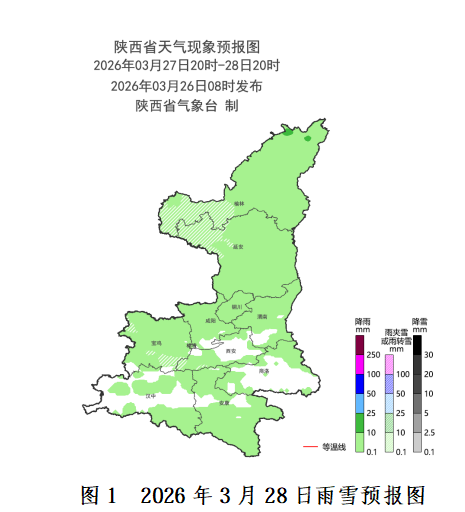 受高空槽东移影响,预计3月27日夜间至30日我省有一次大范围雨雪降温吹风天气过程。全省大部有小雨,秦岭山区东段局地、巴山西段局地有中雨,陕北西部局地、关中西部局地、秦岭山区西段有雨夹雪或小到中雪,局地(西安市周至县、宝鸡市太白县)有大雪。