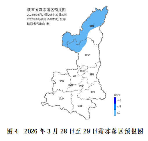 28至29日日平均气温陕北、关中西部、陕南西部下降4℃左右;夜间至清晨陕北西部及北部部分地方有霜冻。