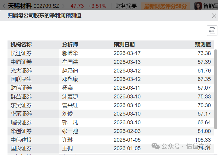 中游电解液等。以市值最高的天赐材料(002709.SH)为例,市值982亿元,按下图中的平均值计算,2026年预期净利润70.09亿元,对应动态PE为14.01倍。