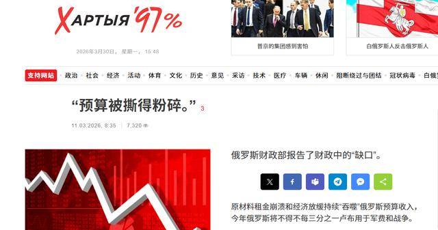 到2026年头两个月,联邦财政赤字已经冲到3.449万亿卢布,几乎是去年同期的1.5倍,光是这两个月的赤字就快赶上全年预估的九成多。有分析人士直言“这才过了两个月,预算已经被撕得粉碎。”
